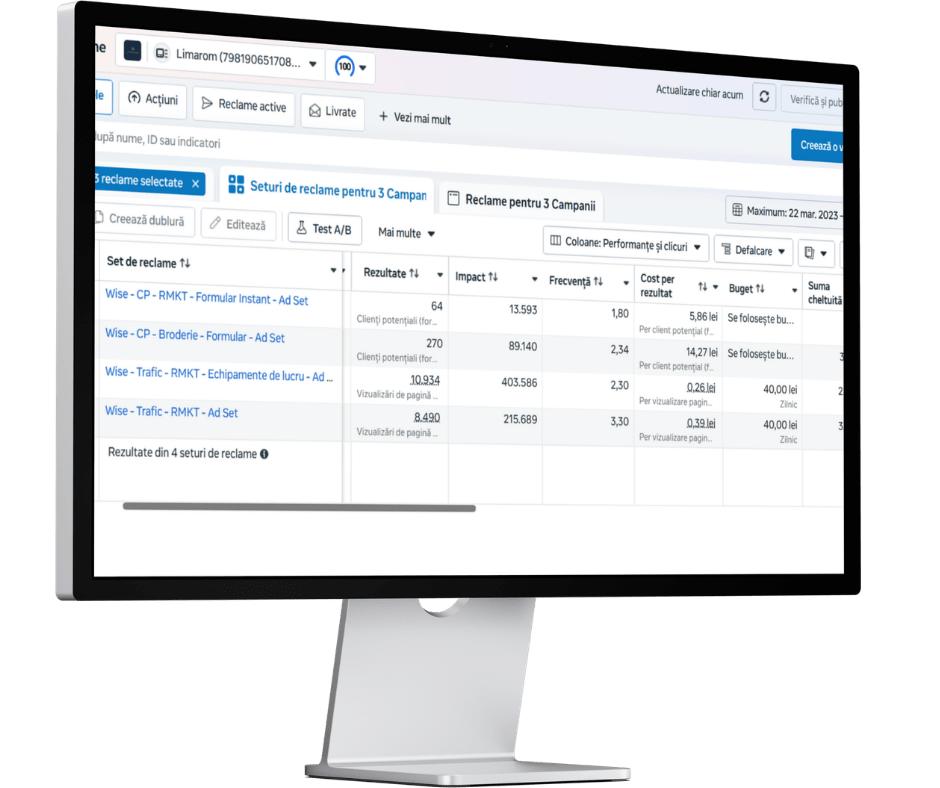 Pe întreaga perioadă a colaborării, campaniile Meta Ads gestionate de WiseVision pentru Limarom au generat rezultate consistente atât în zona de lead generation, cât și pe componenta de trafic și remarketing. Printre rezultatele obținute se numără 64 lead-uri cu un cost per rezultat de 5,86 lei, respectiv 270 lead-uri cu un cost per rezultat de 14,27 lei, dar și peste 10.934 și 8.490 vizualizări de pagină în campanii de remarketing, la costuri eficiente de doar 0,26 lei și 0,39 lei per rezultat. Aceste date reflectă o strategie construită pe segmentare relevantă, optimizare continuă și utilizarea eficientă a bugetelor pentru susținerea vizibilității și a rezultatelor măsurabile.