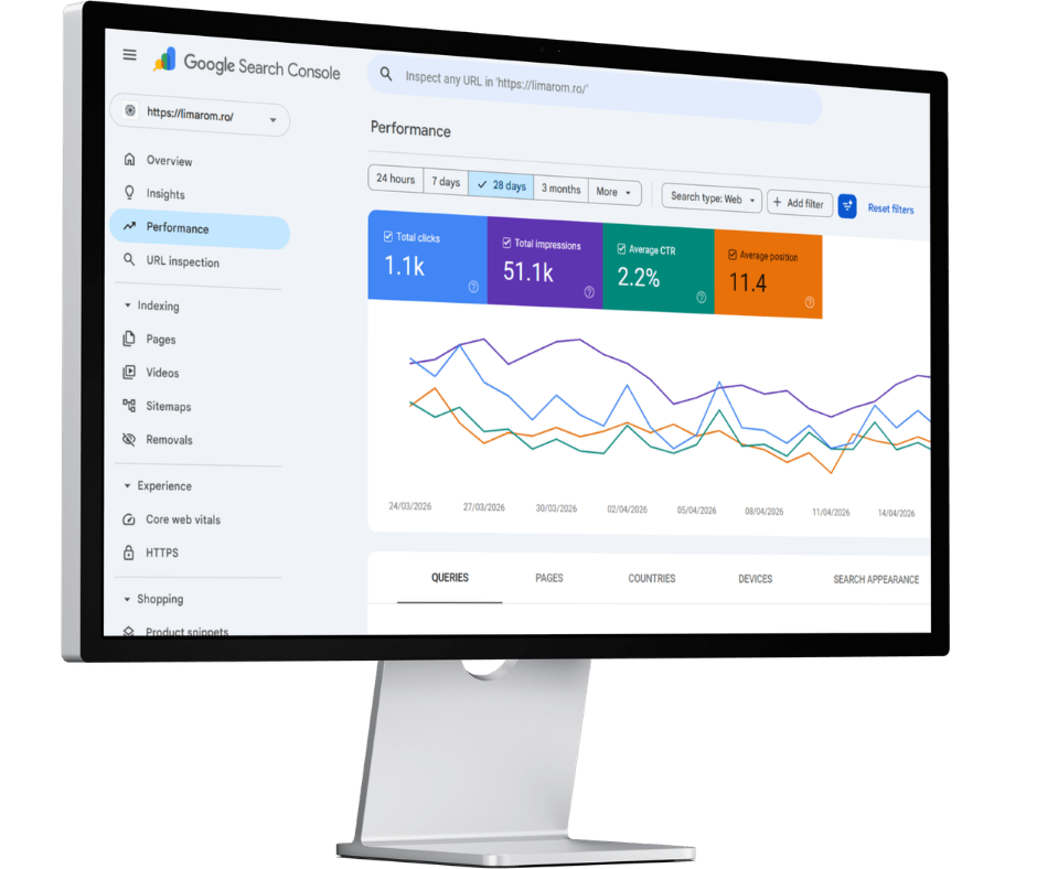Pe parcursul ultimelor 28 de zile, strategia SEO implementată de WiseVision pentru Limarom a contribuit la obținerea a peste 1,1K clickuri organice și 51,1K afișări în Google, menținând un CTR mediu de 2,2% și o poziție medie de 11,4. Pentru WiseVision, aceste rezultate confirmă eficiența unei strategii SEO construite pe optimizare tehnică, structură corectă, relevanță semantică și consolidarea vizibilității pe căutări importante pentru business. Evoluția arată o prezență organică activă și competitivă, cu potențial clar de creștere atât în trafic, cât și în volumul de oportunități generate din căutări relevante.